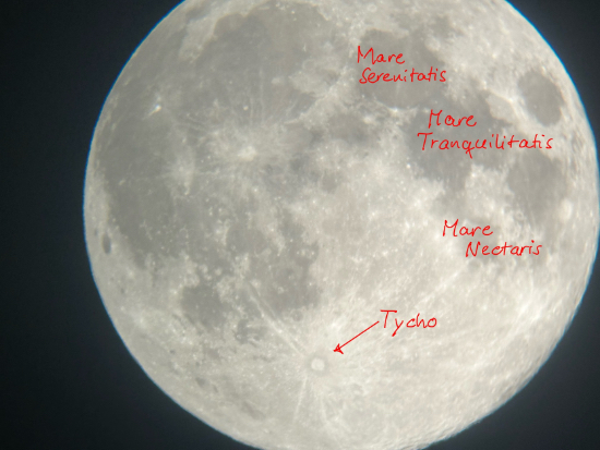 Auf den Bildern erkennt man sehr deutlich den Krater Tycho, der etwa 85 Kilometer groß und 4,7 Kilometer tief ist. Das ist echt beeindruckend, wenn man sich vorstellt, wie alt und gewaltig dieser Einschlag ist. Außerdem sieht man viele dunkle Flächen, die sogenannten Maria (lateinisch für „Meere“). Sie bestehen aus erkalteter Lava und zeigen, dass der Mond früher vulkanisch aktiv war.
