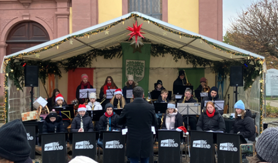 Bei knackig kalten Temperaturen heizte die Big Band am vergangenen Samstag dem Publikum des Hagenbacher St. Michaelsmarkt mit ihren Klängen ein. Aus dem „Standardrepertoire“ begeisterten die Musizierenden unter der Leitung von Markus Metz u.a. mit Titeln wie Eye of the tiger, Via la vida, Nessaja oder auch Don’t stop believing. Feliz Navidad rundete als Zugabe den knapp einstündigen Auftritt ab und stimmte die Anwesenden auf den Abend in vorweihnachtlichem Ambiente ein.
