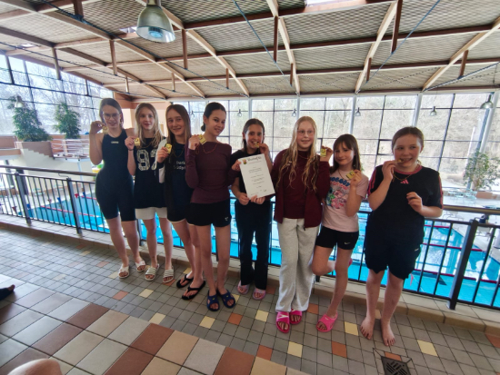 Noch erfolgreicher verlief der Wettkampf für unsere U14-Mädchen. Mit der besten Meldezeit angereist, gingen sie als leichte Favoritinnen ins Rennen – und wurden dieser Rolle eindrucksvoll gerecht. In den Staffelwettbewerben schlugen unsere Schwimmerinnen jeweils einige Sekunden vor ihren stärksten Konkurrentinnen aus Ingelheim an. Spätestens beim abschließenden 10-Minuten-Dauerschwimmen ließen sie keinen Zweifel mehr aufkommen: Die Landesmeisterschaft und damit das Ticket zum Bundesfinale nach Berlin gehörten ihnen. Was für ein Moment!