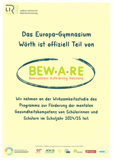 Unsere Schule nimmt ab diesem Schuljahr am BEWARE-Programm des Leibniz Instituts für Resilienzforschung teil. Rund 20 Kolleginnen und Kollegen haben sich dazu bereiterklärt, sich zu BEWARE-Kräften ausbilden zu lassen und die vorgesehenen drei Doppelstunden in allen Klassen der Jahrgänge 5 – 10 im Frühjahr 2025 durchzuführen. Ziel des Programms ist es, Bewusstsein und Aufklärung hinsichtlich psychischer Erkrankungen zu schaffen ohne dabei konkrete Krankheitsbilder in den Fokus zu rücken, die Resilienz der Jugendlichen zu stärken und ihnen Strategien für den Ernstfall an die Hand zu geben. Im Rahmen des nationalen Aktionsplans, der perspektivisch eine Verankerung dieses Themas in schulischen Lehrplänen vorsieht, ergänzt das EGW damit vorab bereits sein Präventionsangebot um diesen wichtigen Baustein.