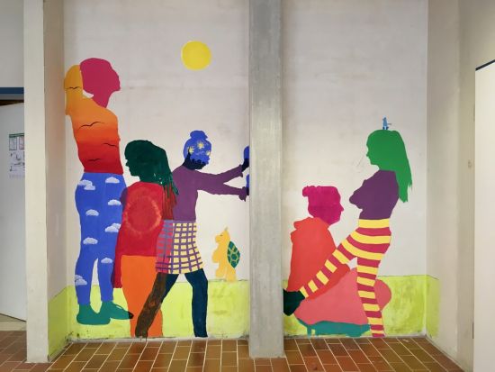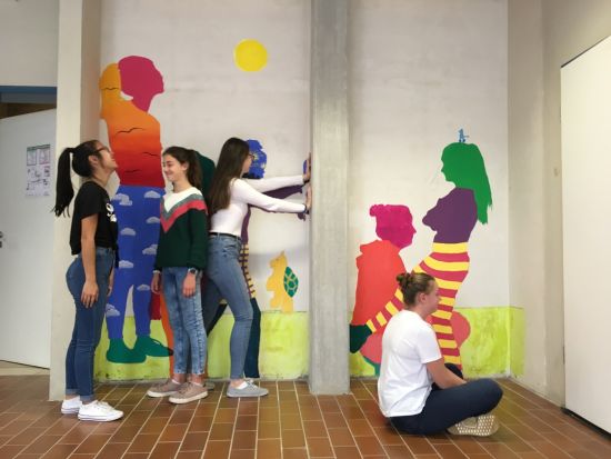 Mit Begeisterung malten Schülerinnen der Kunst AG ihr gemeinsam entwickeltes Wandbild direkt auf die sonst unantastbaren Klassenzimmerwände.