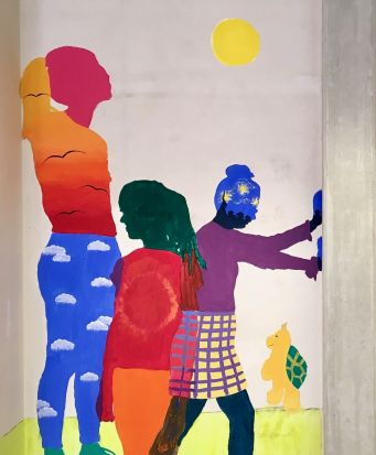 Reste von allerlei Acrylfarben wurden verwendet, um die Wände des Kunst-Vorbereitungsraums im Untergeschoss eindrucksvoll in eine Art Bühne zu verwandeln. „Wir hatten total viel Spass“ ...die Ergebnisse belegen die Lust am kreativen Austoben.