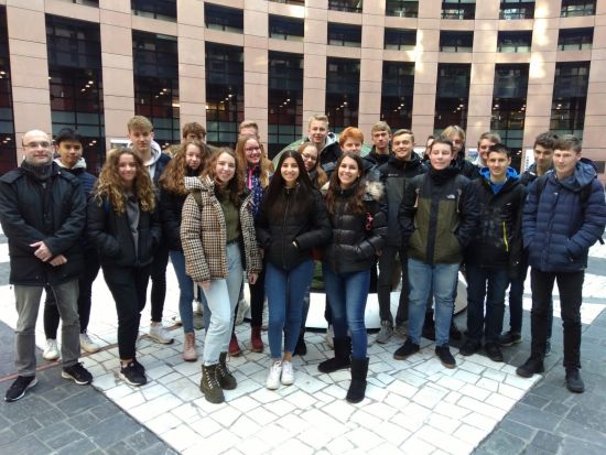 Am 05. Dezember besuchte die Klasse 10e gemeinsam mit den beiden Lehrern Herr Hellenthal und Herr Kern das Europaparlament in Straßburg. Nach einer kurzen Einführung konnte die Klasse an interaktiven Stationen im Besucherbereich des Parlaments viel Wissenswertes über die Aufgaben der Institution in Erfahrung bringen. Im Anschluss war ein Besuch des Plenarsaals möglich, in dem ausgewählte Klassen aus verschiedenen Ländern Europas über Themen diskutierten, welche die Regierungs- und Staatschefs Europas bei ihrem nächsten Treffen besprechen sollten. Dabei ging es um Klimaschutz, die Schwierigkeit Kompromisse zu finden und vieles mehr. Nach den vielen, neu gewonnenen Impressionen ließen die Schüler den Tag auf dem Straßburger Weihnachtsmarkt ausklingen.