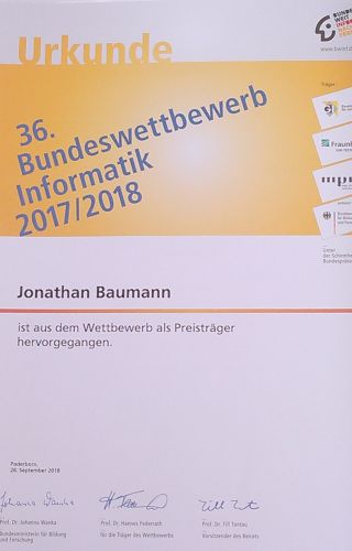 Jonathan Baumann Preisträger beim 36. Bundeswettbewerb Informatik